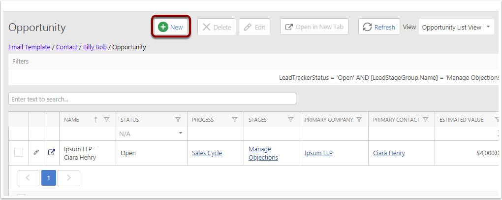 New Button in Opportunity list View